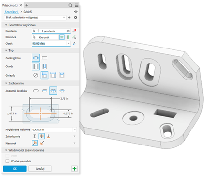 - Opcja Otwór prosty lub Otwór przejściowy umożliwia określenie szczeliny względem rozmiaru części złącznej.